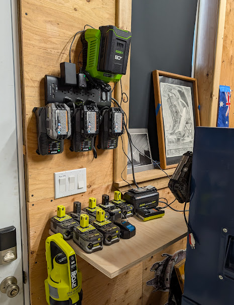 All her gardening tools use the same battery, so something near the garden area was in order. The second door to the shop was the perfect spot.