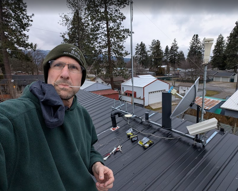 This is before I moved Coles ACARS and Iridium antennas over. Just next to my ear, look closely, you can see the antennas on Cole's shop. They are going to be a good bit higher on my shop roof. Never a bad thing for an antenna.