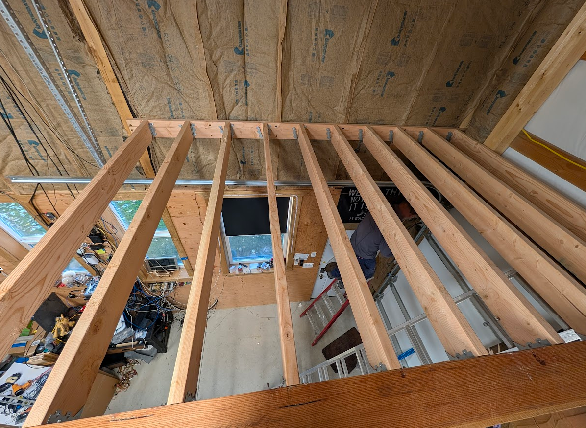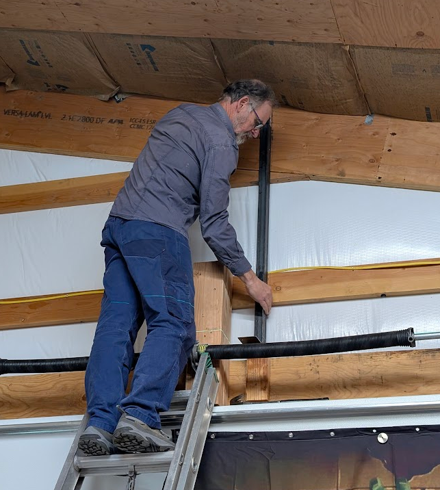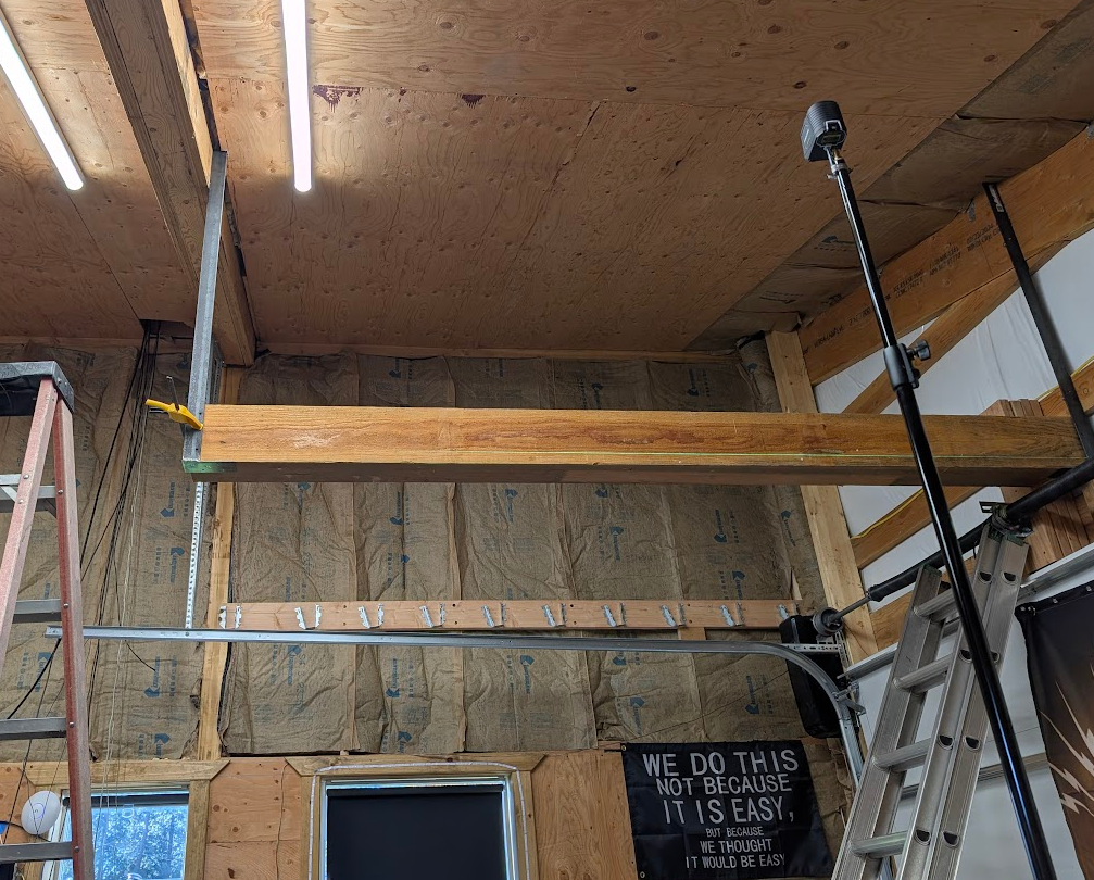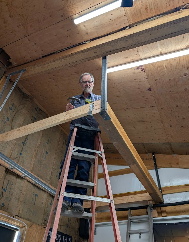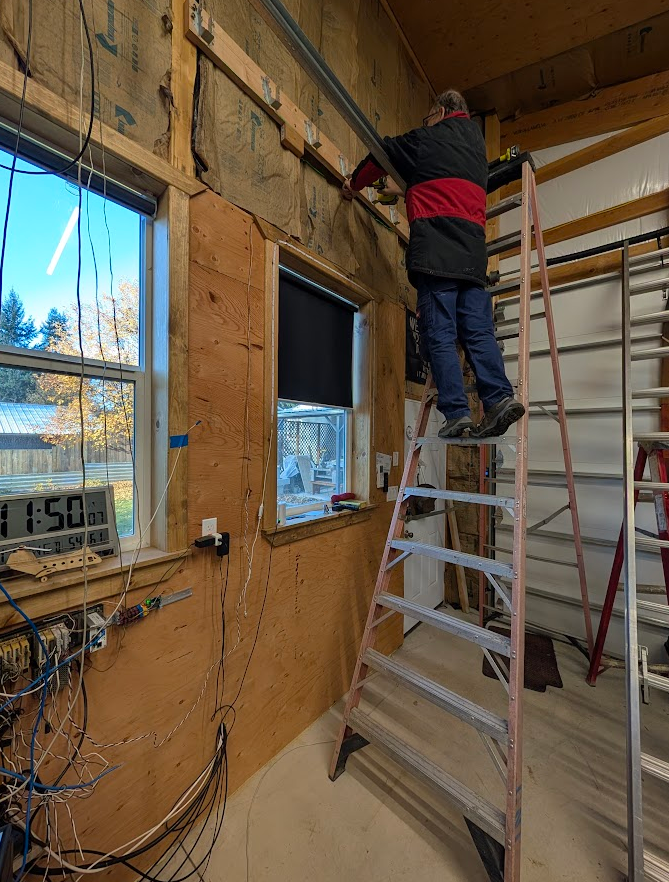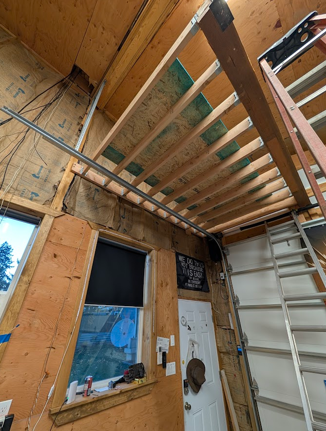 The shop roof is crazy high because (I asked the previous owner who had the shop built), he wanted a one-way sloping roof to self-clear the snow.