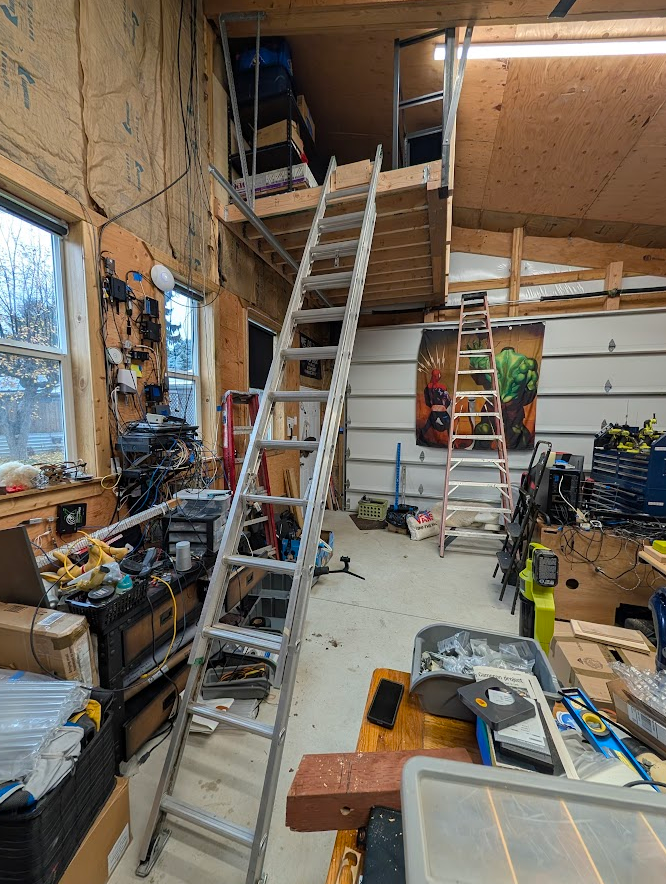 Put a chock in for my ladder. I am looking at used sales for a one-piece 15-foot ladder. The extension is heavy and is used elsewhere. I don't plan to leave it set up all the time, but it will be for a little while as I get the shelves on the right-hand side assembled and the small totes sorted and installed.